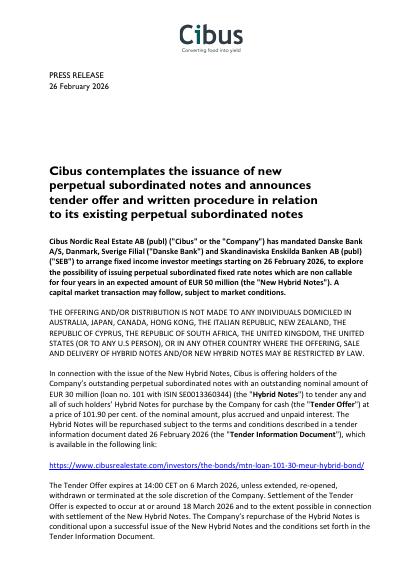 In connection with the issue of the New Hybrid Notes, Cibus is offering holders of the Company's outstanding perpetual subordinated notes with an outstanding nominal amount of EUR 30 million (loan no. 101 with ISIN SE0013360344) (the "Hybrid Notes") to tender any and all of such holders' Hybrid Notes for purchase by the Company for cash (the "Tender Offer") at a price of 101.90 per cent. of the nominal amount, plus accrued and unpaid interest. The Hybrid Notes will be repurchased subject to the terms and conditions described in a tender information document dated 26 February 2026 (the "Tender Information Document"), which is available in the following link: