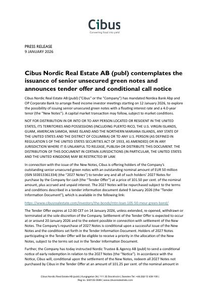 In connection with the issue of the New Notes, Cibus is offering holders of the Company's outstanding senior unsecured green notes with an outstanding nominal amount of EUR 50 million (ISIN SE0013361334) (the "2027 Notes") to tender any and all of such holders' 2027 Notes for purchase by the Company for cash (the "Tender Offer") at a price of 101.50 per cent. of the nominal amount, plus accrued and unpaid interest. The 2027 Notes will be repurchased subject to the terms and conditions described in a tender information document dated 9 January 2026 (the "Tender Information Document"), which is available in the following link:
