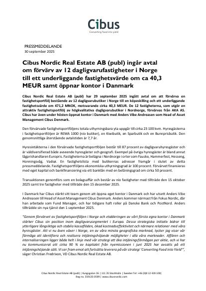 Cibus Nordic Real Estate AB (publ) har 29 september 2025 ingått avtal om att förvärva en fastighetsportfölj bestående av 12 dagligvarubutiker i Norge till en köpeskilling och ett underliggande fastighetsvärde om 471,2 MNOK, motsvarande cirka 40,3 MEUR. De 12 fastigheterna, som utgör en attraktiv fastighetsportfölj av högkvalitativa dagligvarubutiker i Nordnorge, förvärvas från AKA AS. Cibus har även under hösten öppnat kontor i Danmark med Anders Vibe Andreasen som Head of Asset Management Cibus Denmark.