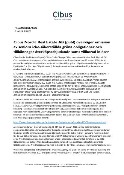 Cibus Nordic Real Estate AB (publ) ("Cibus" eller "Bolaget") har mandaterat Nordea Bank Abp och OP Corporate Bank att arrangera möten med ränteinvesterare från och med den 12 januari 2026, för att undersöka möjligheten att emittera seniora icke-säkerställda gröna obligationer med rörlig ränta och en löptid på 4,0 år (de "Nya Obligationerna"). En kapitalmarknadstransaktion kan följa, beroende av marknadsförhållanden.