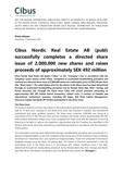 Cibus Nordic Real Estate AB (publ) successfully completes a directed share issue of 2,000,000 new shares and raises proceeds of approximately SEK 492 million