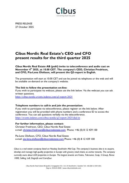 Cibus Nordic Real Estate AB (publ) invite to teleconference and audio cast on November 4th 2025, at 10.00 CET. The company's CEO, Christian Fredrixon, and CFO, Pia-Lena Olofsson, will present the Q3-report in English.