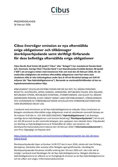 Cibus Nordic Real Estate AB (publ) ("Cibus" eller "Bolaget") har mandaterat Danske Bank A/S, Danmark, Sverige Filial ("Danske Bank") och Skandinaviska Enskilda Banken AB (publ) ("SEB") att arrangera möten med investerare från och med den 26 februari 2026, för att undersöka möjligheten att emittera efterställda obligationer med fast ränta utan slutdatum vilka är icke-inlösningsbara under fyra år till ett förväntat belopp om EUR 50 miljoner (de "Nya Hybridobligationerna"). Beroende av marknadsförhållanden så kan en kapitalmarknadstransaktion följa.