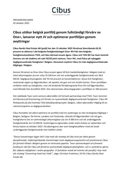 Cibus Nordic Real Estate AB (publ) har den 15 oktober 2025 förvärvat återstående 69,35 procent av aktierna i det belgiska fastighetsbolaget One+ NV från den belgiska fastighetsutvecklaren TS33, och blev därmed ensam ägare. Cibus och TS33 BV har även kommit överens om att etablera ett nytt 50/50 joint venture, Two+ NV, med fokus på nybyggda dagligvaruankrade fastigheter i Belgien. Dessutom avyttrar Cibus tre icke-dagligvarurelaterade tillgångar i Belgien.