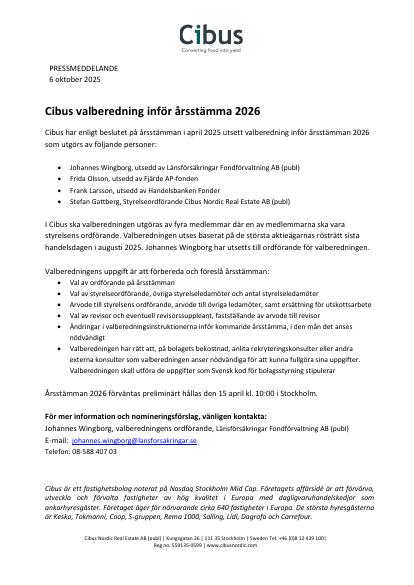 Cibus har enligt beslutet på årsstämman i april 2025 utsett valberedning inför årsstämman 2026 som utgörs av följande personer: