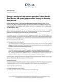 Nasdaq has today, March 7, 2018, approved Cibus Nordic Real Estate AB (publ) ("Cibus" or "the Company") for listing on Nasdaq First North. The approval is subject to the fulfilment of customary requirements. First day of trading in Cibus' shares is planned to commence on March 9, 2018, under the ticker symbol "CIBUS".