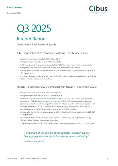 This information is information that Cibus Nordic Real Estate AB (publ) is obliged to make public pursuant to the EU Market Abuse Regulation 596/2014. The information was submitted for publication, through the agency of the contact person set out above, at 07:30 CET on 4 November 2025.