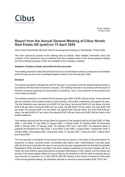 Report from the Annual General Meeting of Cibus Nordic Real Estate AB (publ) on 15 April 2026