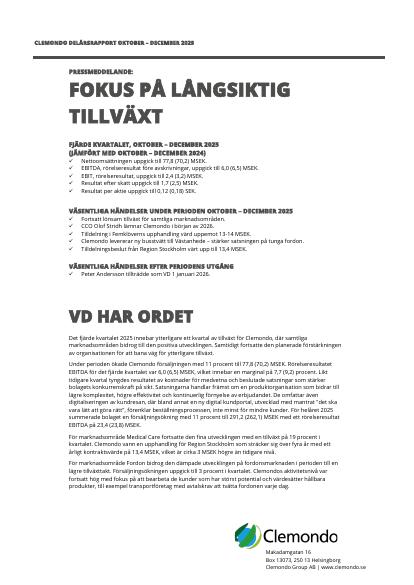 Under perioden ökade Clemondo försäljningen med 11 procent till 77,8 (70,2) MSEK. Rörelseresultatet EBITDA för det fjärde kvartalet var 6,0 (6,5) MSEK, vilket innebar en marginal på 7,7 (9,2) procent. Likt tidigare kvartal tyngdes resultatet av kostnader för medvetna och beslutade satsningar som stärker bolagets konkurrenskraft på sikt. Satsningarna handlar främst om en produktorganisation som bidrar till lägre komplexitet, högre effektivitet och kontinuerlig förnyelse av erbjudandet. De omfattar även digitaliseringen av kundresan, där bland annat en ny digital kundportal, utvecklad med mantrat "det ska vara lätt att göra rätt", förenklar beställningsprocessen, inte minst för mindre kunder. För helåret 2025 summerade bolaget en försäljningsökning med 11 procent till 291,2 (262,1) MSEK med ett rörelseresultat EBITDA på 23,4 (23,8) MSEK.