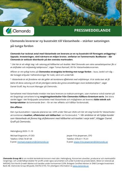 Den nya busstvätten i Uppsala planeras tas i drift under februari 2026 och blir ett steg framåt för Västanhede i att kombinera kvalitet, effektivitet och hållbarhet i sin fordonsvård. "- Vår ambition är att hjälpa kunder som Västanhede att förena hög driftekonomi med hållbarhet och kvalitet i varje tvätt", tillägger Daniel Graff på Clemondo.