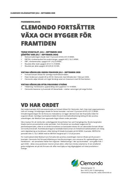 Det tredje kvartalet 2025 kännetecknades av fortsatt tillväxt för Clemondo, helt i linje med organisationens mål och strategi. Försäljningen ökade för femte kvartalet i rad med 13 procent till 65,3 (57,7) MSEK. Omsättningsökningen för de första nio månaderna i år ligger därmed över det finansiella målet för organisk tillväxt. Samtliga marknadsområden förutom kontraktstillverkning bidrog till den positiva utvecklingen, där Medical Care uppvisade högst tillväxt under perioden.