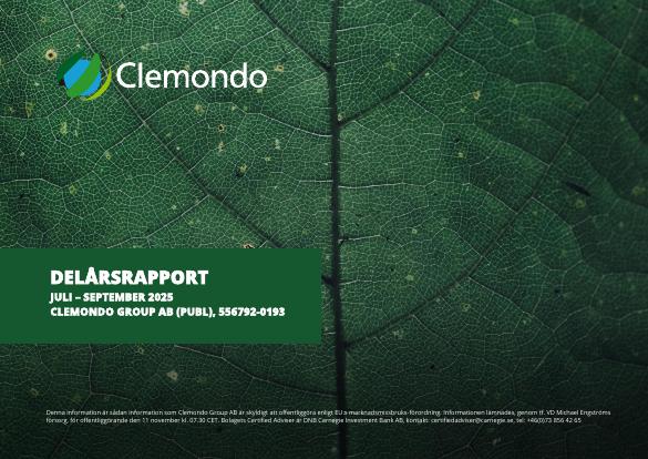 Tisdagen den 11 november, klockan 07.30 CET, publiceras denna kvartalsrapport. Dagen efter kommer en inspelad presentation av kvartalsrapporten finnas tillgänglig på Youtube via DNB Carnegie Play på följande länk: https://www.youtube.com/@DNBCarnegiePlay/search?query=clemondo