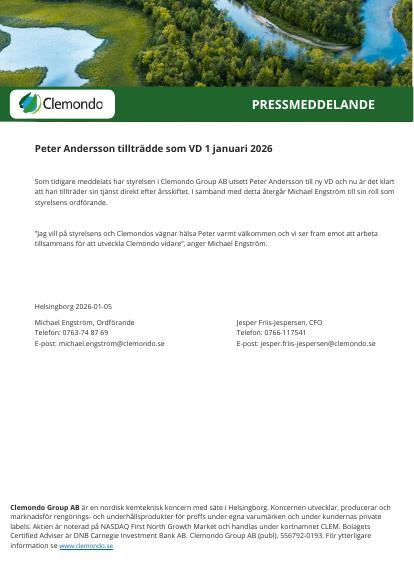 Som tidigare meddelats har styrelsen i Clemondo Group AB utsett Peter Andersson till ny VD och nu är det klart att han tillträder sin tjänst direkt efter årsskiftet. I samband med detta återgår Michael Engström till sin roll som styrelsens ordförande.