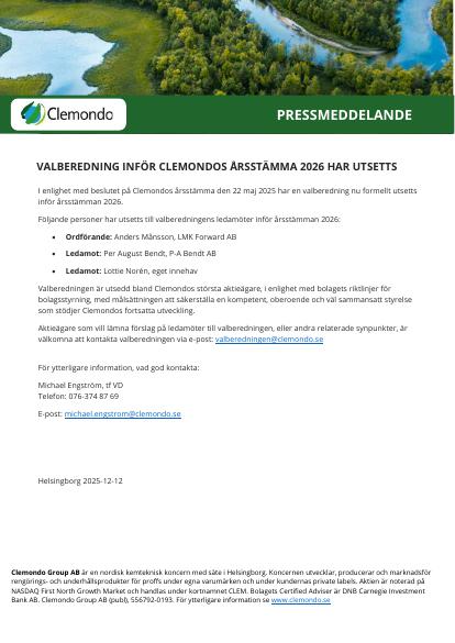 I enlighet med beslutet på Clemondos årsstämma den 22 maj 2025 har en valberedning nu formellt utsetts inför årsstämman 2026.