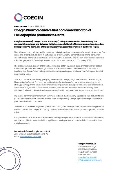 Coegin Pharma AB ("Coegin" or the "Company") today announces that the Company has successfully produced and delivered its first commercial batch of hair growth products based on Follicopeptide® to Gents, one of the leading premium grooming retailers in the Nordic region.