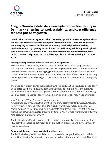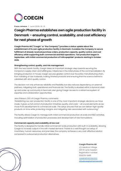 Coegin Pharma AB ("Coegin" or "the Company") provides a status update about the establishment of its own agile production facility in Denmark. It enables the Company to secure fulfillment of already received purchase orders, production capacity, quality control, and cost efficiency while supporting both commercial and R&D operations. Test production began in September, with initial commercial production of Follicopeptide® products starting in October 2025.