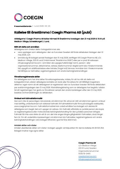 Aktieägarna i Coegin Pharma AB kallas härmed till årsstämma torsdagen den 21 maj 2026 kl. 10.00 på Medicon Village, Scheeletorget 1, i Lund.