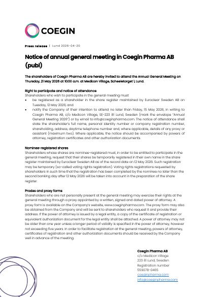 The shareholders of Coegin Pharma AB are hereby invited to attend the Annual General Meeting on Thursday, 21 May 2026 at 10:00 a.m. at Medicon Village, Scheeletorget 1, Lund.
