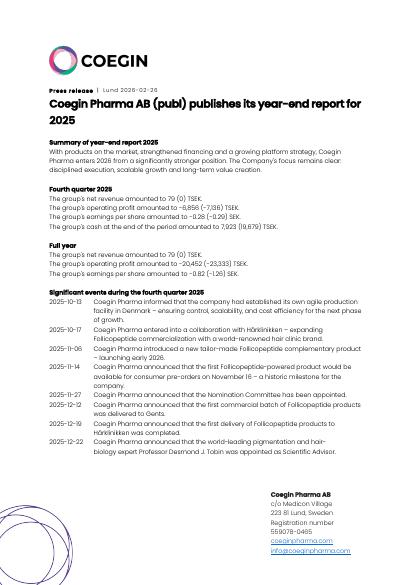 With products on the market, strengthened financing and a growing platform strategy, Coegin Pharma enters 2026 from a significantly stronger position. The Company's focus remains clear: disciplined execution, scalable growth and long-term value creation.