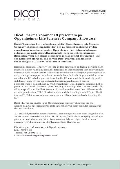 Dicot Pharma har blivit inbjudna att delta i Oppenheimer Life Sciences Company Showcase som hålls idag. I en ny rapport publicerad av den amerikanska investmentbanken Oppenheimer, identifieras hälsosamt åldrande som nästa stora tillväxtområde inom biotechinvesteringar. Rapporten lyfter den starka kopplingen mellan erektil dysfunktion (ED) och hälsosamt åldrande, och belyser Dicot Pharmas kandidat för behandling av ED, LIB-01, som särskilt intressant.