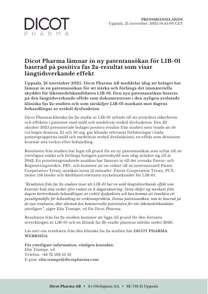 Uppsala, 21 november 2025. Dicot Pharma AB meddelar idag att bolaget har lämnat in en patentansökan för att stärka och förlänga det immateriella skyddet för läkemedelskandidaten LIB-01. Den nya patentansökan baseras på den långtidsverkande effekt som dokumenterats i den nyligen avslutade kliniska fas 2a-studien och som särskiljer LIB-01 markant mot dagens behandlingar av erektil dysfunktion.