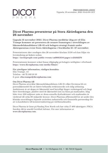 Uppsala 13 november 2025. Dicot Pharma meddelar idag att vd Elin Trampe kommer att presentera de senaste framstegen i utvecklingen av läkemedelskandidaten LIB-01 och bolagets strategi framåt under Aktiespararnas event Stora Aktiedagarna i Stockholm 25-27 november.