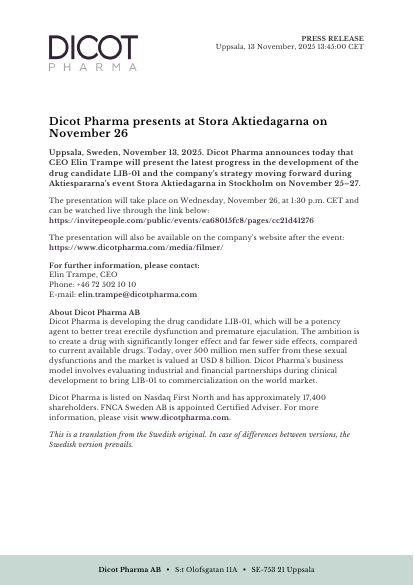 Uppsala, Sweden, November 13, 2025. Dicot Pharma announces today that CEO Elin Trampe will present the latest progress in the development of the drug candidate LIB-01 and the company's strategy moving forward during Aktiespararna's event Stora Aktiedagarna in Stockholm on November 25-27.
