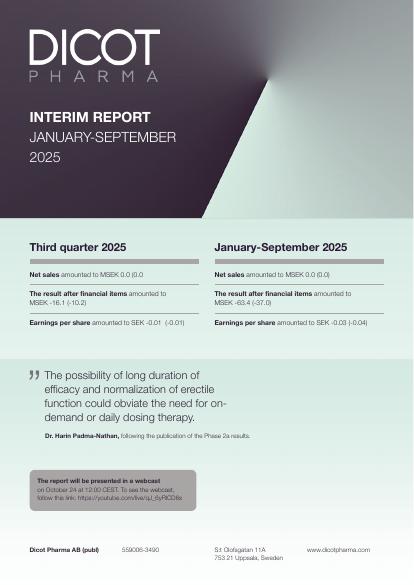 Uppsala, Sweden, October 23, 2025. Dicot Pharma AB publishes its interim report for the third quarter of 2025. The report is available as an attached document and on www.dicotpharma.com. The company will present the report and results from the phase 2a study published earlier today in a webcast on Friday October 24 at 12.00 CEST, a broadcast that may also be viewed afterwards.