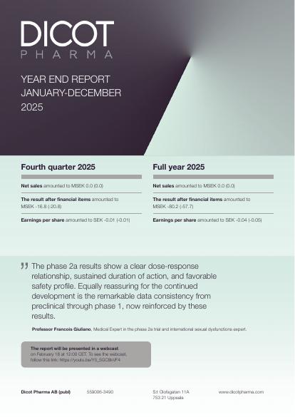 Uppsala, Sweden, February 18, 2026. Dicot Pharma AB publishes its Year-End Report for 2025. The report is available as an attached document and on www.dicotpharma.com. The company will present the report in a webcast on Wednesday February 18 at 12.00 CET, a broadcast that may also be viewed afterwards.