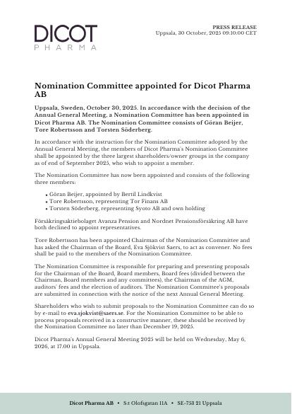 Uppsala, Sweden, October 30, 2025. In accordance with the decision of the Annual General Meeting, a Nomination Committee has been appointed in Dicot Pharma AB. The Nomination Committee consists of Göran Beijer, Tore Robertsson and Torsten Söderberg.