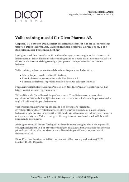 Uppsala, 30 oktober 2025. Enligt årsstämmans beslut har en valberedning utsetts i Dicot Pharma AB. Valberedningen består av Göran Beijer, Tore Robertsson och Torsten Söderberg.