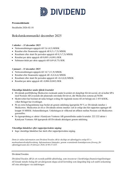 Detta är sådan information som Dividend Sweden AB är skyldigt att offentliggöra enligt EU:s marknadsmissbruksförordning. Informationen lämnades, genom ovanstående kontaktpersons försorg, för offentliggörande den 18 februari 2026, kl 08.15 CET.
