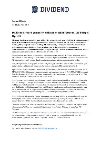 Dividend Swedens styrelse har med stöd av det bemyndigande man erhöll vid årsstämman den 8 april 2025 fattat beslut om att genomförvärva en riktad emission om 1,5 MSEK mot Notecom Holding AB (publ) och Tristan Holding AB på kursen 0,33 kr i syfte att stärka likviditet och utöka samarbetet med bolagen. Styrelsen har även beslutat att i närtid genomföra en företrädesemission, den kommer enligt förslag att vara på 3 MSEK och kursen sättas till 0,27 kr, styrelseledamöterna kommer att teckna sin prorata-andel.