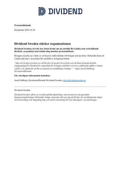 "Jag och övriga styrelsen ser att Bo gör ett mycket bra arbete och att hans fortsatta heltidsengagemang för Dividend är avgörande för bolagets stabilitet och att ro påbörjade affärer i hamn, varför vi är glada för att Bo accepterat en anställning i bolaget." - säger Jacob Dalborg, Styrelseordförande