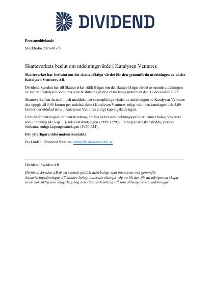 Dividend Sweden har till Skatteverket ställt frågan om det skattepliktiga värdet avseende utdelningen av aktier i Katalysen Ventures som beslutades på den extra bolagsstämman den 17 december 2025.