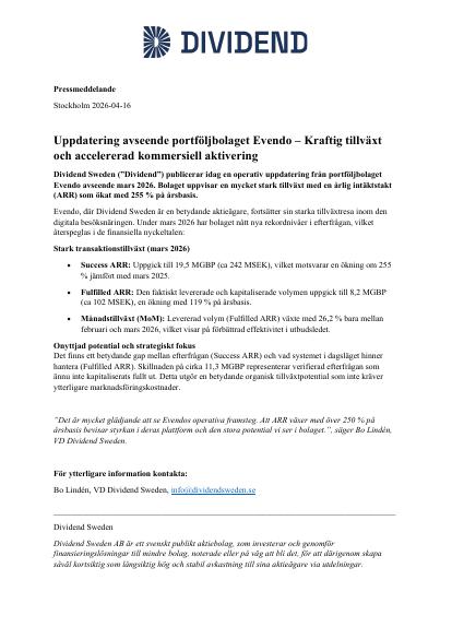 Dividend Sweden ("Dividend") publicerar idag en operativ uppdatering från portföljbolaget Evendo avseende mars 2026. Bolaget uppvisar en mycket stark tillväxt med en årlig intäktstakt (ARR) som ökat med 255 % på årsbasis.
