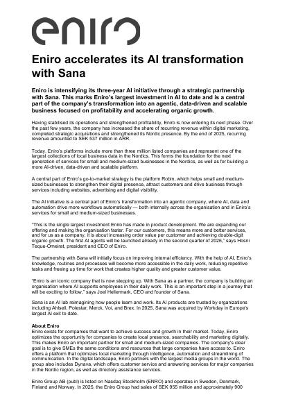 Eniro is intensifying its three-year AI initiative through a strategic partnership with Sana. This marks Eniro’s largest investment in AI to date and is a central part of the company’s transformation into an agentic, data-driven and scalable business focused on profitability and accelerating organic growth.