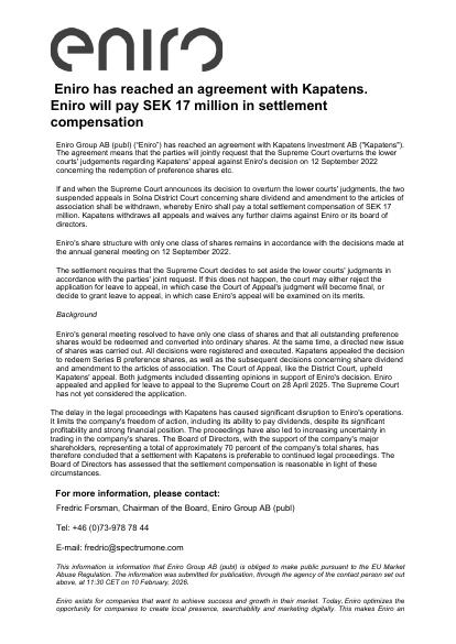 Eniro Group AB (publ) ("Eniro") has reached an agreement with Kapatens Investment AB ("Kapatens"). The agreement means that the parties will jointly request that the Supreme Court overturns the lower courts' judgements regarding Kapatens' appeal against Eniro's decision on 12 September 2022 concerning the redemption of preference shares etc. If and when the Supreme Court announces its decision to overturn the lower courts' judgments, the two suspended appeals in Solna District Court concerning share dividend and amendment to the articles of association shall be withdrawn, whereby Eniro shall pay a total settlement compensation of SEK 17 million. Kapatens withdraws all appeals and waives any further claims against Eniro or its board of directors. Eniro's share structure with only one class of shares remains in accordance with the decisions made at the annual general meeting on 12 September 2022. The settlement requires that the Supreme Court decides to set aside the lower courts' judgments in accordance with the parties' joint request. If this does not happen, the court may either reject the application for leave to appeal, in which case the Court of Appeal's judgment will become final, or decide to grant leave to appeal, in which case Eniro's appeal will be examined on its merits.