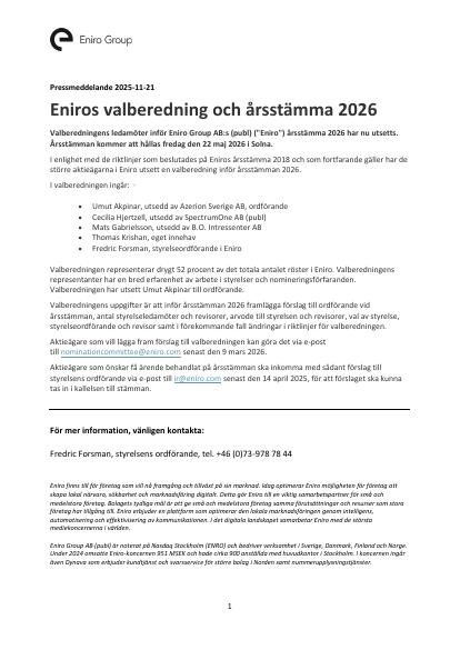 I enlighet med de riktlinjer som beslutades på Eniros årsstämma 2018 och som fortfarande gäller har de större aktieägarna i Eniro utsett en valberedning inför årsstämman 2026.