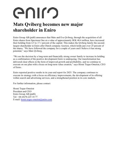 Eniro Group AB (publ) announces that Mats and Eva Qviberg, through the acquisition of all Eniro shares from Spectrum One at a value of approximately SEK 40.6 million, have increased their holding from 4.5 to 17.1 percent of the capital. This makes the Qviberg family the second-largest shareholder in Eniro after Dutch company Azerion, which holds just over 25 percent of the shares. “We have followed the company for a couple of years and I believe it has strong potential,” says Mats Qviberg.