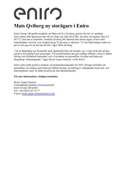 Eniro Group AB (publ) meddelar att Mats och Eva Qviberg, genom förvärv av samtliga Eniro‑aktier från Spectrum One till ett värde om cirka 40,6 Mkr, har ökat sitt innehav från 4,5 till 17,1 procent av kapitalet. Familjen Qviberg blir därmed näst största ägare i Eniro efter nederländska Azerion, som innehar drygt 25 procent av aktierna. "Vi har följt bolaget under ett par år och jag tror att det kan bli bra" säger Mats Qviberg.