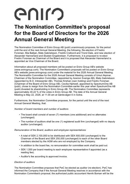Information about all proposed members will be posted on Eniro Group AB's website (www.enirogroup.com). The Nomination Committee's proposals will be posted on Eniro Group AB's website (www.enirogroup.com) under the material for the 2026 Annual General Meeting. The Nomination Committee for the 2026 Annual General Meeting consists of Umut Akpinar, Chairman of the Nomination Committee, (appointed by Azerion Sverige AB), Mats Gabrielsson (appointed by B.O. Intressenter AB), Thomas Krishan (own holding) and Fredric Forsman (Chairman of the Board of Eniro Group AB). Cecilia Hjertzell, appointed by SpectrumOne AB (publ), chose to resign from the Nomination Committee earlier this year when SpectrumOne AB (publ) divested its shareholding in Eniro Group AB. The Nomination Committee represents approximately 40.22 % of the votes in Eniro Group AB. The date of the Annual General Meeting is May 22, 2026, at 11.00 am at Gårdsvägen 6 in Solna.