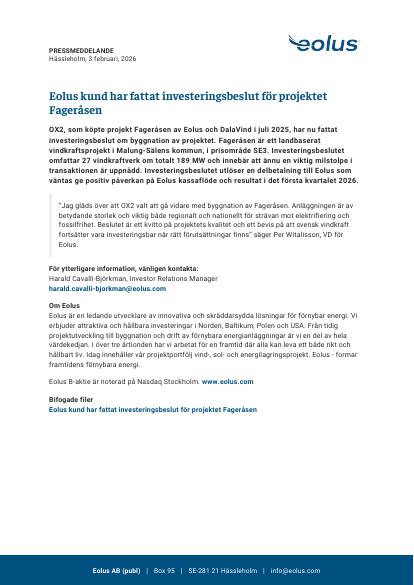 OX2, som köpte projekt Fageråsen av Eolus och DalaVind i juli 2025, har nu fattat investeringsbeslut om byggnation av projektet. Fageråsen är ett landbaserat vindkraftsprojekt i Malung-Sälens kommun, i prisområde SE3. Investeringsbeslutet omfattar 27 vindkraftverk om totalt 189 MW och innebär att ännu en viktig milstolpe i transaktionen är uppnådd. Investeringsbeslutet utlöser en delbetalning till Eolus som väntas ge positiv påverkan på Eolus kassaflöde och resultat i det första kvartalet 2026.