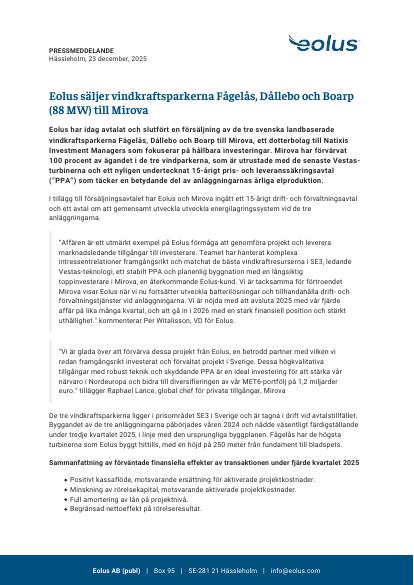 Denna information är sådan information som Eolus är skyldigt att offentliggöra enligt EU:s marknadsmissbruksförordning. Informationen lämnades, genom ovanstående kontaktpersoners försorg, för offentliggörande den 2025-12-23 16:55 CET.