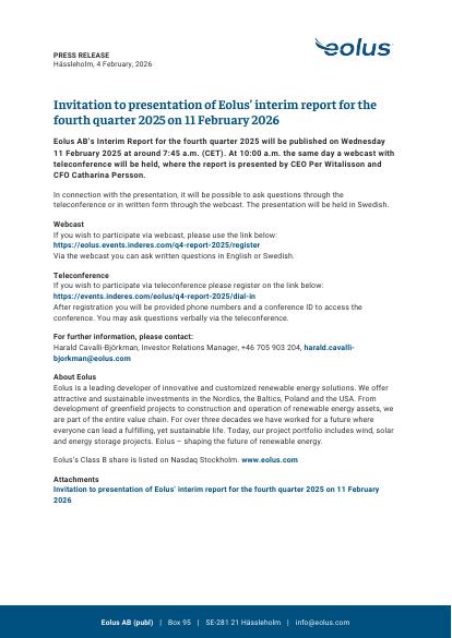 Eolus AB’s Interim Report for the fourth quarter 2025 will be published on Wednesday 11 February 2025 at around 7:45 a.m. (CET). At 10:00 a.m. the same day a webcast with teleconference will be held, where the report is presented by CEO Per Witalisson and CFO Catharina Persson.