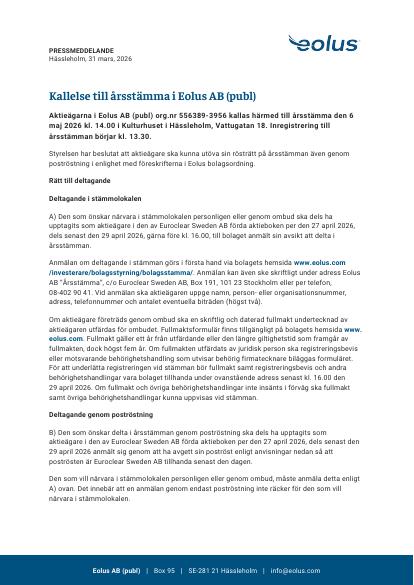 Aktieägarna i Eolus AB (publ) org.nr 556389-3956 kallas härmed till årsstämma den 6 maj 2026 kl. 14.00 i Kulturhuset i Hässleholm, Vattugatan 18. Inregistrering till årsstämman börjar kl. 13.30.