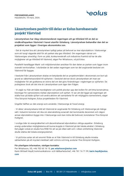 - Det är mycket bra att Länsstyrelsen tydligt pekar på behovet av mer elproduktion i Västsverige som ett tungt vägande skäl för att parken ska ges tillstånd. Om regeringen värnar om Västsveriges utvecklig i form av jobb, konkurrenskraft och industrins framtid så har de alla möjligheter att ge tillstånd till Västvind, säger Per Witalisson, vd på Eolus.