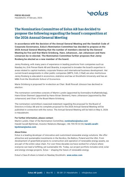 The nomination committee's reasoned statement regarding the proposal for the Board of Directors in Eolus AB and its complete proposal for the 2026 Annual General Meeting will be published in connection with the notice. The Annual General Meeting will be held on May 6, 2026 in Hässleholm.