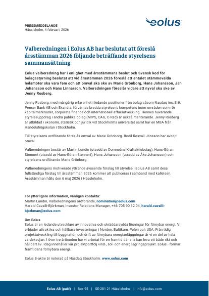 Valberedningens motiverade yttrande avseende förslag till styrelse i Eolus AB samt dess fullständiga förslag till årsstämman 2026 kommer att publiceras i samband med kallelsen. Årsstämman hålls den 6 maj 2026 i Hässleholm.