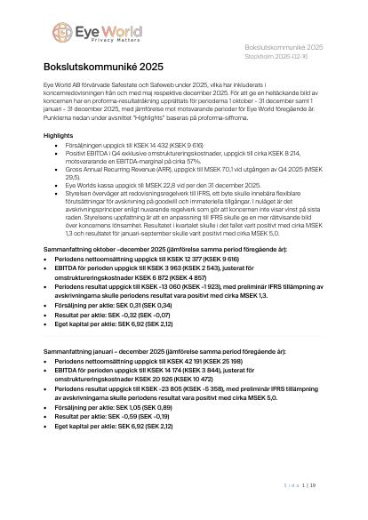 Eye World AB förvärvade Safestate och Safeweb under 2025, vilka har inkluderats i koncernredovisningen från och med maj respektive december 2025. För att ge en heltäckande bild av koncernen har en proforma-resultaträkning upprättats för perioderna 1 oktober - 31 december samt 1 januari - 31 december 2025, med jämförelse mot motsvarande perioder för Eye World föregående år. Punkterna nedan under avsnittet "Highlights" baseras på proforma-siffrorna.